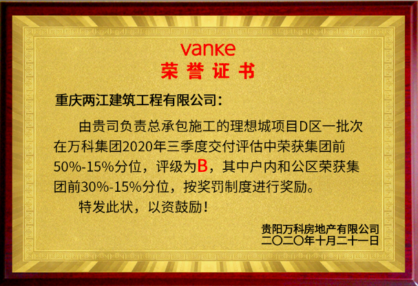 2020年三季度交付评估中荣获万科集团前50-15分位评级为B